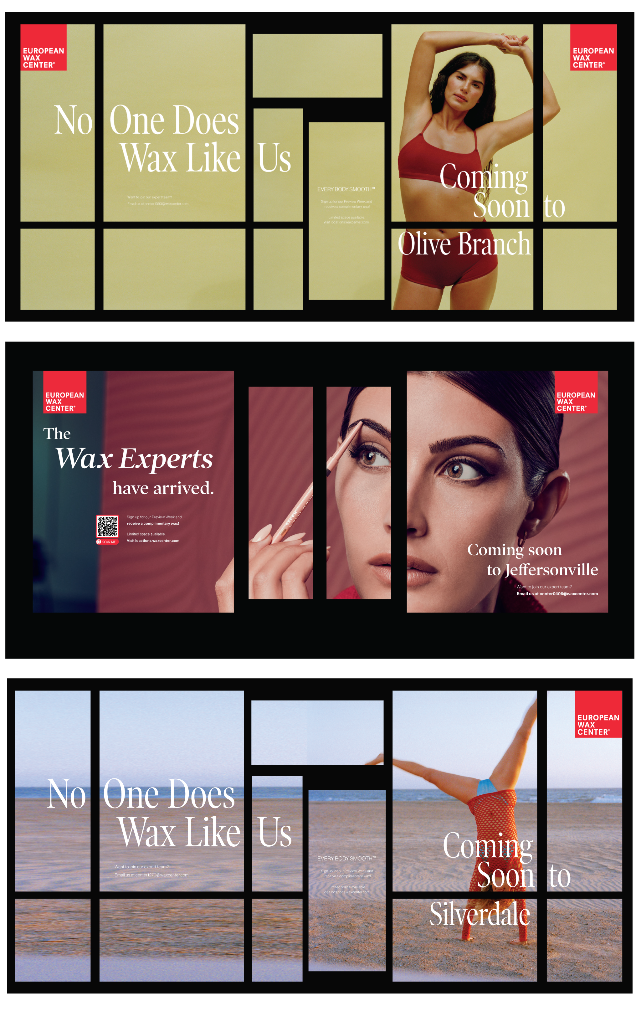 Before each European Wax Center opens, the store has to be covered to block the view of construction. I was task with designing the covers that displayed QR codes to book your wax in advance and encourage guests to visit the center for their first wax free.